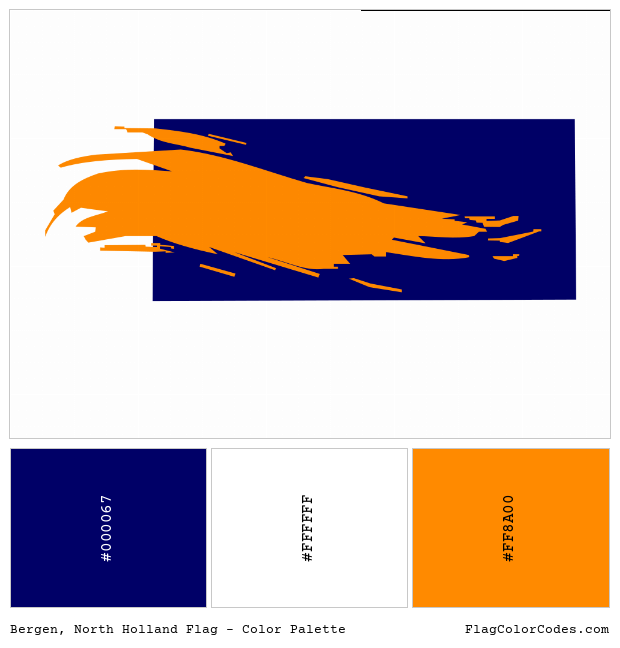 The Bergen, North Holland flag has 3 primary colors, which are blue, white and orange. The table below has the common and popular codes of these colors in HEX, RGB and CMYK formats along with Pantone (PMS), RAL and NCS (Natural Color System). Please note that HEX and RGB codes are to be used for digital works and web pages (including HTML and CSS) while the CMYK values are for printers.