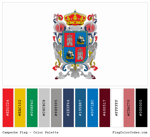 Download the Campeche flag Color Palette image along with the color hex codes as a single image. These are the suggested colors to be used for digital media. For print and spot color values, please refer to the information above. The Pantone® (PMS) values and RAL.
