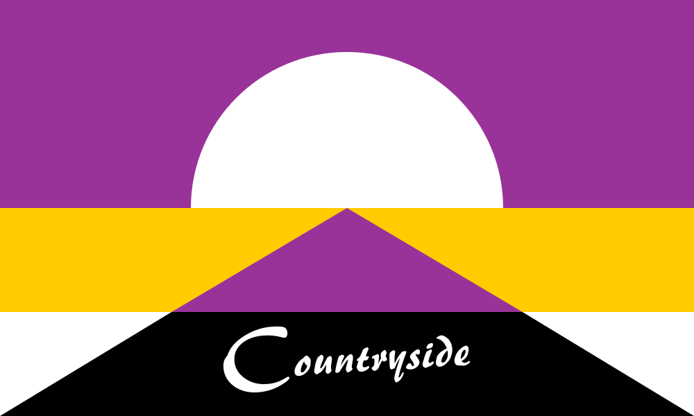 The Countryside flag has 4 primary colors, which are purple, white, yellow and black. The table below has the common and popular codes of these colors in HEX, RGB and CMYK formats along with Pantone (PMS), RAL and NCS (Natural Color System). Please note that HEX and RGB codes are to be used for digital works and web pages (including HTML and CSS) while the CMYK values are for printers.