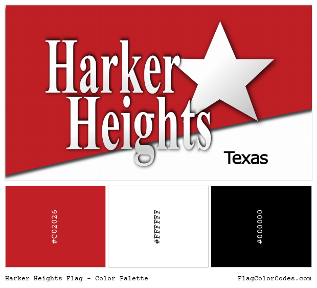 The Harker Heights flag has 3 primary colors, which are red, white and black. The table below has the common and popular codes of these colors in HEX, RGB and CMYK formats along with Pantone (PMS), RAL and NCS (Natural Color System). Please note that HEX and RGB codes are to be used for digital works and web pages (including HTML and CSS) while the CMYK values are for printers.
