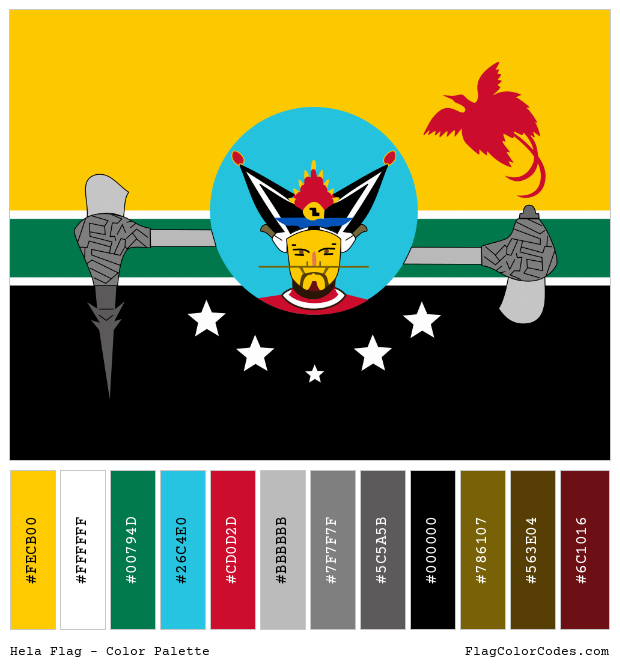 The Hela flag has 12 primary colors, which are yellow, white, green, blue, red, grey, grey, grey, black, gold, brown and maroon. The table below has the common and popular codes of these colors in HEX, RGB and CMYK formats along with Pantone (PMS), RAL and NCS (Natural Color System). Please note that HEX and RGB codes are to be used for digital works and web pages (including HTML and CSS) while the CMYK values are for printers.