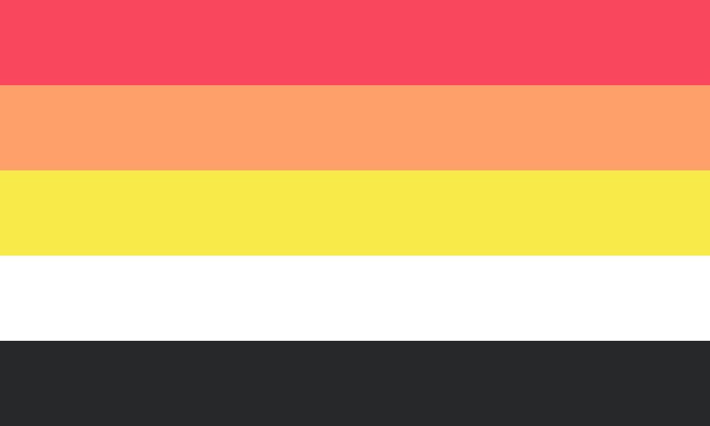 The Lithsexual flag has 5 primary colors, which are red, orange, yellow, white and black. The table below has the common and popular codes of these colors in HEX, RGB and CMYK formats along with Pantone (PMS), RAL and NCS (Natural Color System). Please note that HEX and RGB codes are to be used for digital works and web pages (including HTML and CSS) while the CMYK values are for printers.
