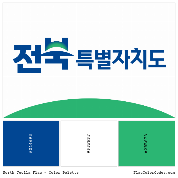 The North Jeolla flag has 3 primary colors, which are blue, whitegreen. The table below has the common and popular codes of these colors in HEX, RGB and CMYK formats along with Pantone (PMS), RAL and NCS (Natural Color System). Please note that HEX and RGB codes are to be used for digital works and web pages (including HTML and CSS) while the CMYK values are for printers.