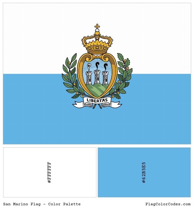 Download the Sanmarinese flag Color Palette image along with the color hex codes as a single image. These are the suggested colors to be used for digital media. For print and spot color values, please refer to the information above. The Pantone® (PMS) values and RAL.