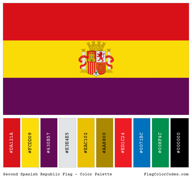Download the Second Spanish Republic flag Color Palette image along with the color hex codes as a single image. These are the suggested colors to be used for digital media. For print and spot color values, please refer to the information above. The Pantone® (PMS) values and RAL.