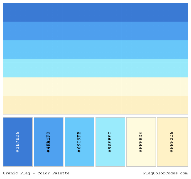 Download the Uranic flag Color Palette image along with the color hex codes as a single image. These are the suggested colors to be used for digital media. For print and spot color values, please refer to the information above. The Pantone® (PMS) values and RAL.
