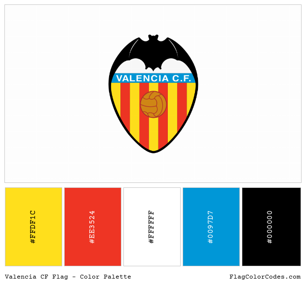 Download the Valencia CF flag Color Palette image along with the color hex codes as a single image. These are the suggested colors to be used for digital media. For print and spot color values, please refer to the information above. The Pantone® (PMS) values and RAL.