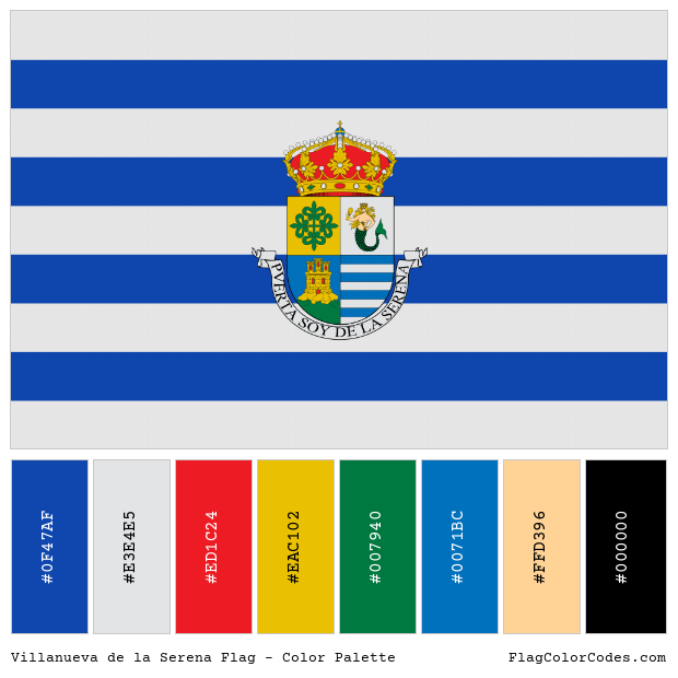 Download the Villanueva de la Serena flag Color Palette image along with the color hex codes as a single image. These are the suggested colors to be used for digital media. For print and spot color values, please refer to the information above. The Pantone® (PMS) values and RAL.