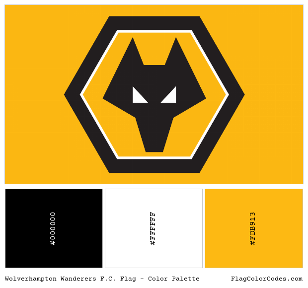 Download the Wolverhampton Wanderers F.C. flag Color Palette image along with the color hex codes as a single image. These are the suggested colors to be used for digital media. For print and spot color values, please refer to the information above. The Pantone® (PMS) values and RAL.